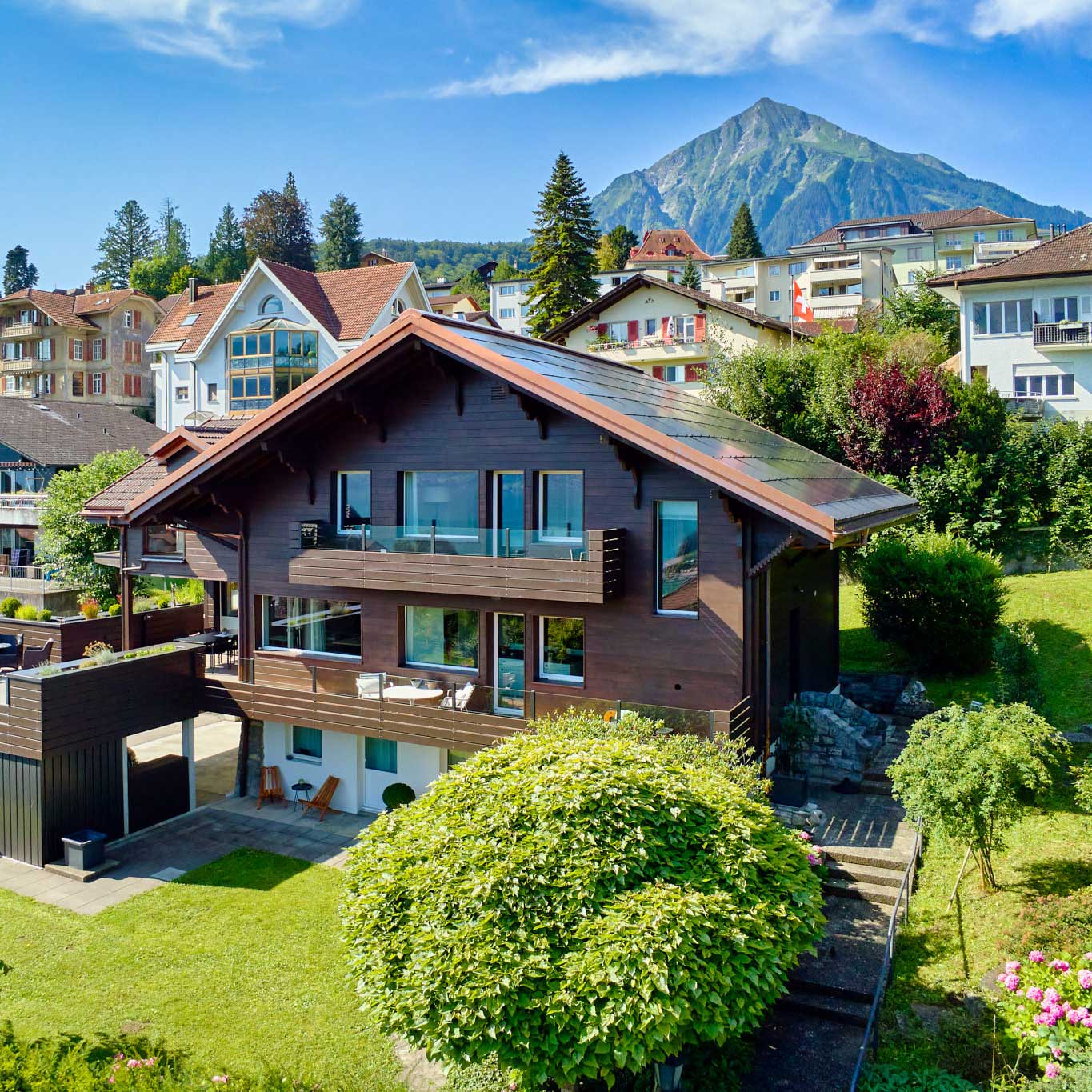Das malerisch über der Spiezer Bucht gelegene Wohnhaus der Familie Brunner strahlt von A bis Z besten Wohnkomfort aus. Die makellos gestrichene Fassade, die verzierten Trägerbalken und die perfekt aufeinander abgestimmten Hausanbauten zeugen von Stilbewusstsein und einem hohen Qualitätsanspruch. Diese Linientreue führt sich auch auf dem Dach fort, auf dem die Indach-Solaranlage installiert werden sollte. Allenbach Holzbau und Solartechnik wurde mit der Konzeption und Installation der Anlage beauftragt. Dafür verwendeten sie Photovoltaik-Elemente von 3S Solar aus Thun. Der Wohneigentümer, Hanspeter Brunner, übernahm in Eigenregie die Spenglerarbeiten. So arbeitete er während der Bauarbeiten Hand in Hand mit den Solarholzbauern zusammen. Die Arbeit der Solarholzbauer überzeugte ihn, also folgte im Anschluss an die Installation der Photovoltaik-Anlage auch noch der Umbau der oberen Etage. Dort wurde das gesamte Badezimmer versetzt und vergrössert und so viel Platz für neue Ideen geschaffen.